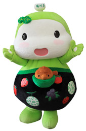 妖精の国からやって来て静岡県菊川市民になったきくのん。頭に湯呑み、おなかに急須をつけて「お茶処菊川」をPRしています。実は、このアイテム、他の菊川の特産に取り替え可能!
